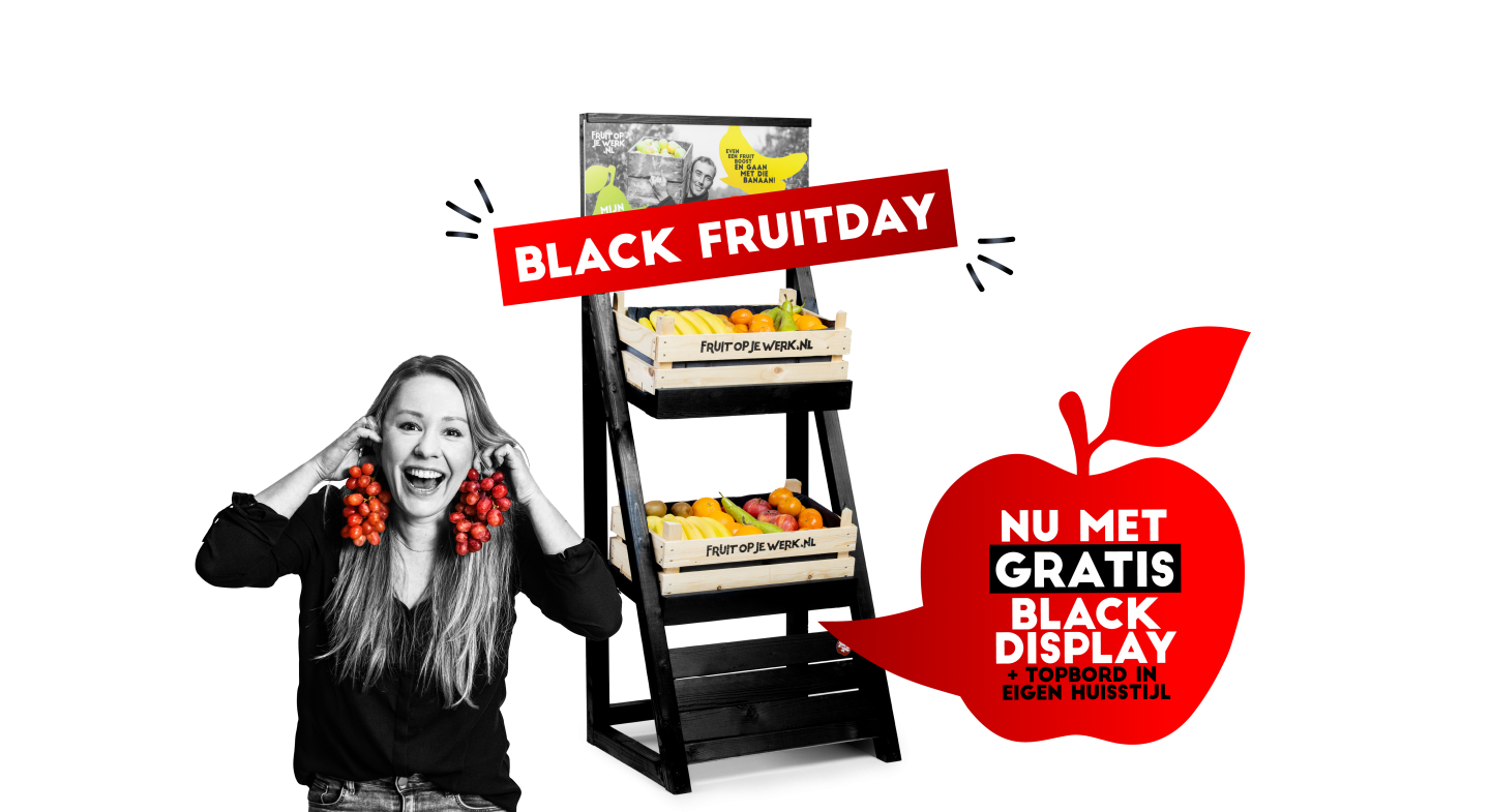 Het is Black Friday-week bij FRUIT OP JE WERK en dat laten we niet onopgemerkt voorbijgaan. Ons fruit is een feest van kleur en deze week combineren we dat natuurlijk met (hoe kan het ook anders) onze stijlvolle BLACK-display. Gratis voor nieuwe klanten én direct een duidelijk herkenbaar uitgiftepunt voor alle medewerkers. En dat is nog niet alles: naast de GRATIS BLACK-display ontvangen jullie ook een topbord in huisstijl cadeau!