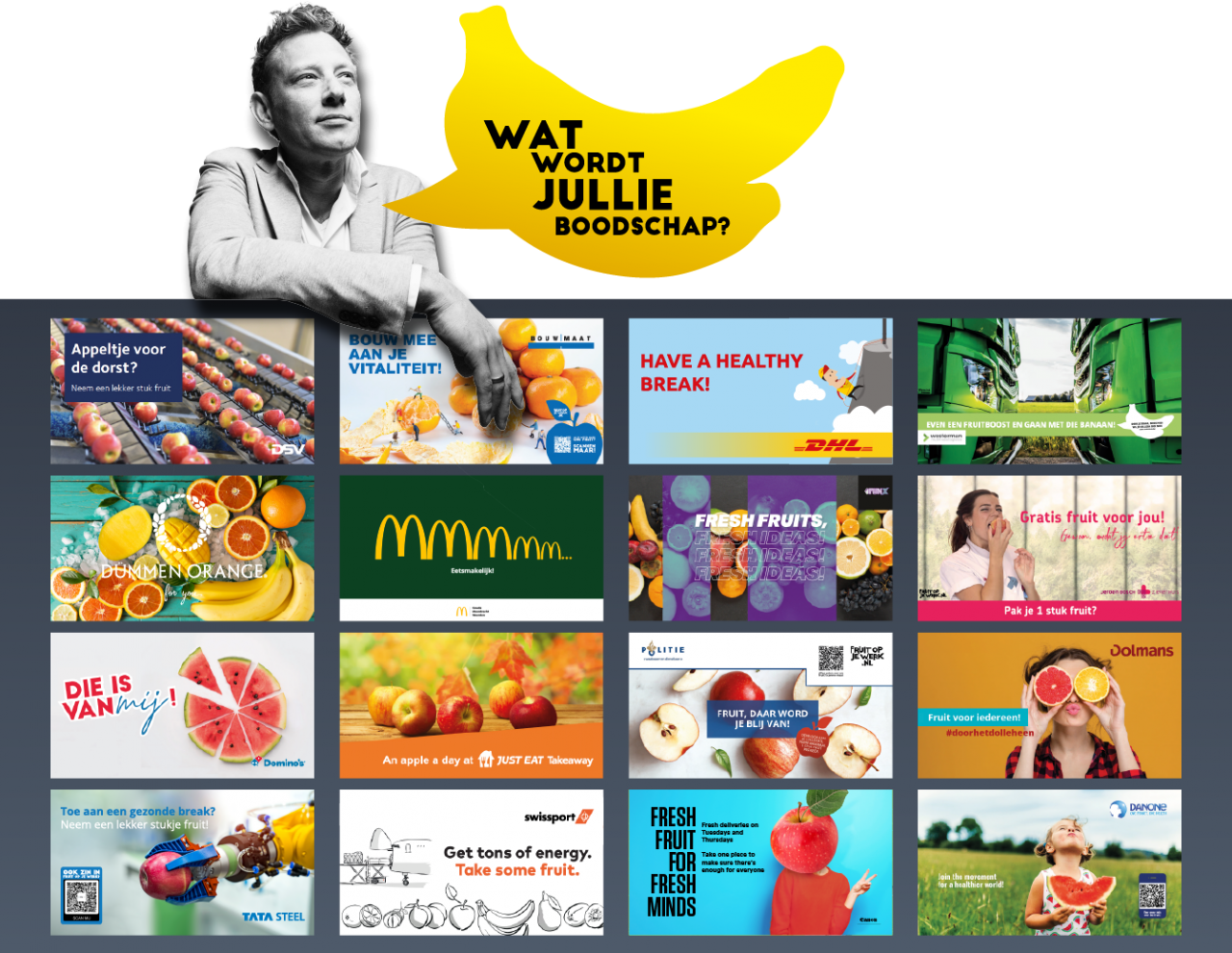 Bij het aanbieden van werkfruit speelt de presentatie een belangrijke rol. Je kunt zelf kiezen of je gebruik wilt maken van onze fruitboxen of liever gaat voor een presentatie in een fruitschaal. Met ons uitnodigende presentatiemateriaal richten wij ons op het creëren van een gezonde beleving. Onze fruitdisplays kunnen daarom worden uitgevoerd in jullie eigen huisstijl. Zo wordt jullie vitaliteitsbeleid of gezonde boodschap dagelijks op een laagdrempelige wijze onder de aandacht gebracht. Zie hier de ontwerpen van een selectie van onze klanten!